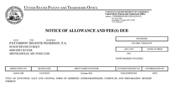 日前,珍寶島藥業(yè)收到美國專利局頒布的名為《一種穿心蓮內(nèi)酯改構(gòu)化合物的鹽型、晶型及其制備方法》發(fā)明專利授權(quán)通知書。其專利申請?zhí)枮?/span>US 16/616,300,專利權(quán)期限為申請之日起20年。
